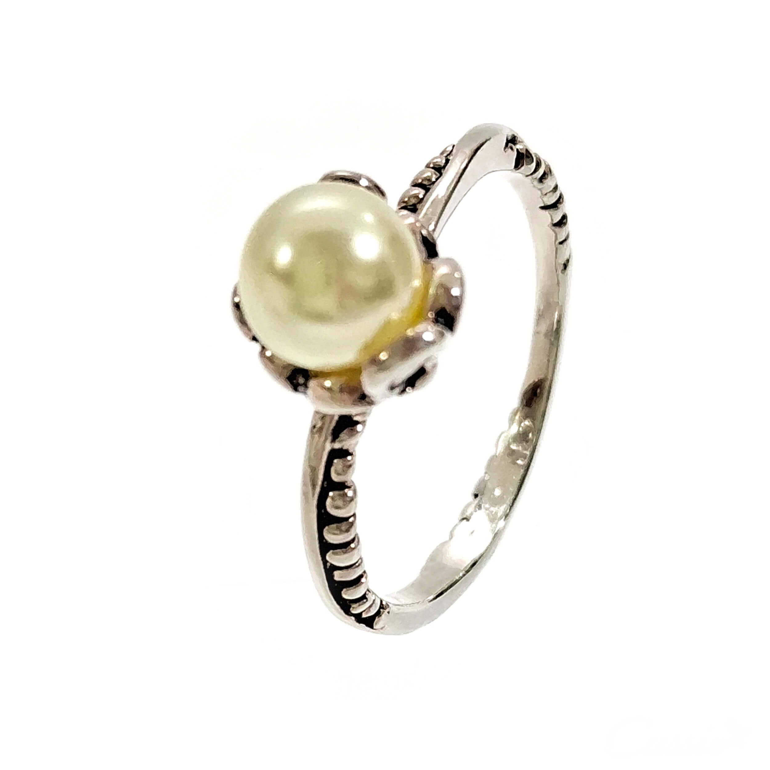 Anel solitário de pérola sintética, com base de "flor" e acabamento envelhecido para realçar os detalhes do anel.