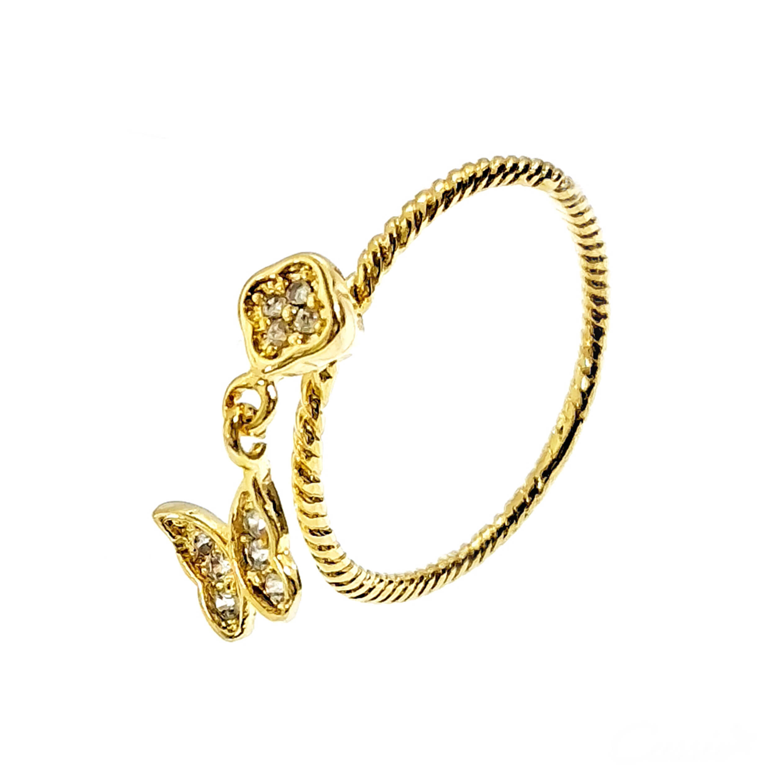Anel fininho trabalhado, tipo solitário de trevinho com zircônias e pingente de borboleta de zircônias.