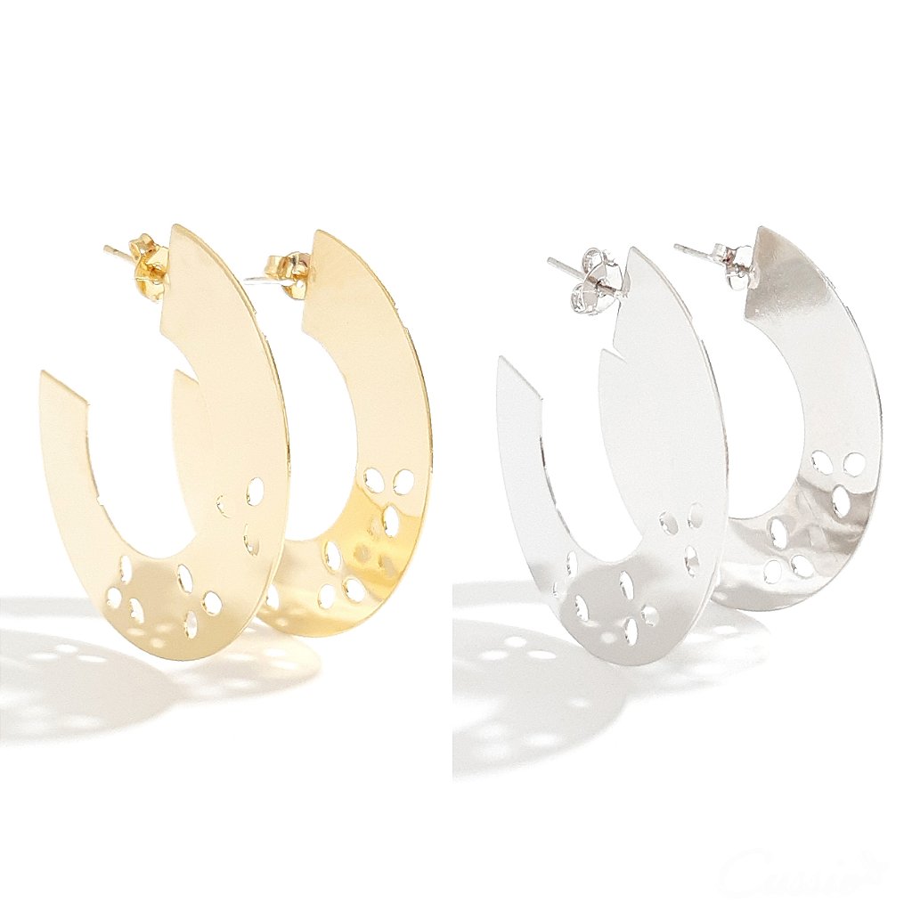 Brinco argola meia lua de pino em chapa com detalhes vazados em flor.