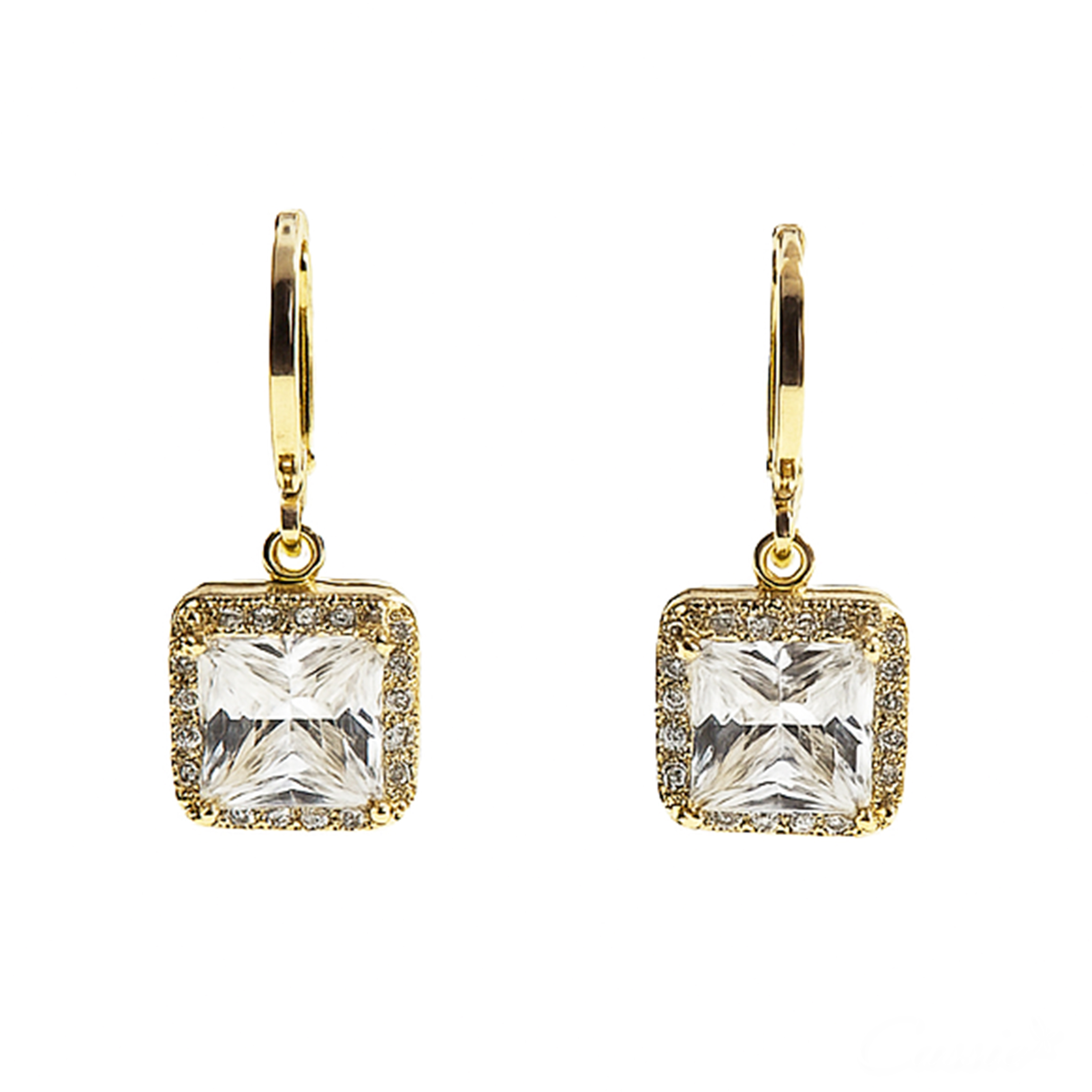 Brinco argola pingente quadrado com zircônias.