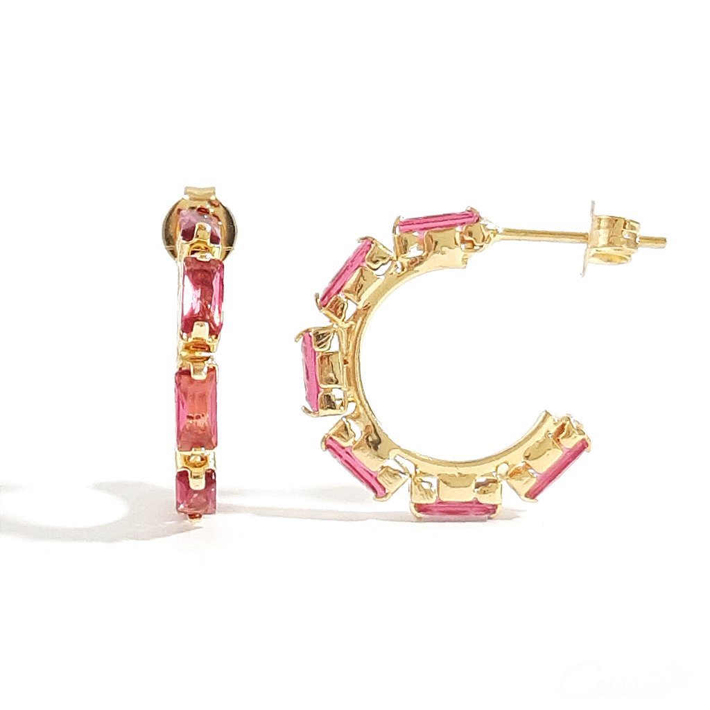 Brinco argola de pino com zircônias retangulares na cor rubi (vermelho).