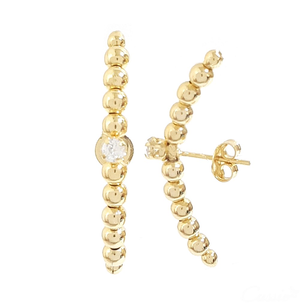 Brinco curvado, tipo ear hook, com bolinhas e zircônia.