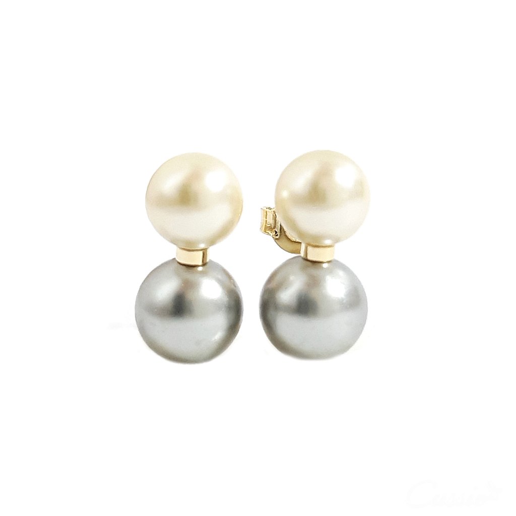 Brinco de duas pérolas sintéticas, uma branca e uma cinza.