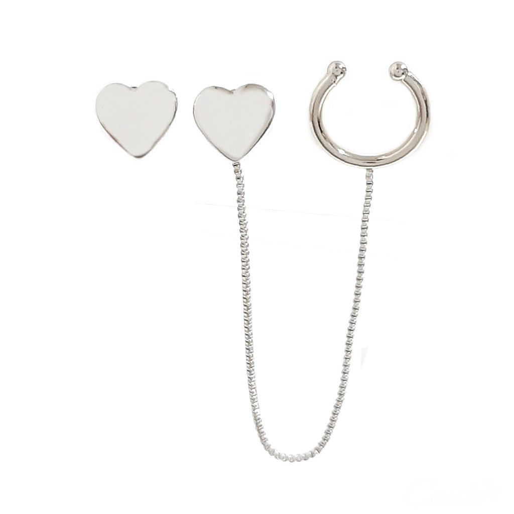 Brinco lindo e diferente. Um brinco é pequeno de coração liso. O outro brinco é de coração com corrente veneziana e piercing fake de tubo liso.