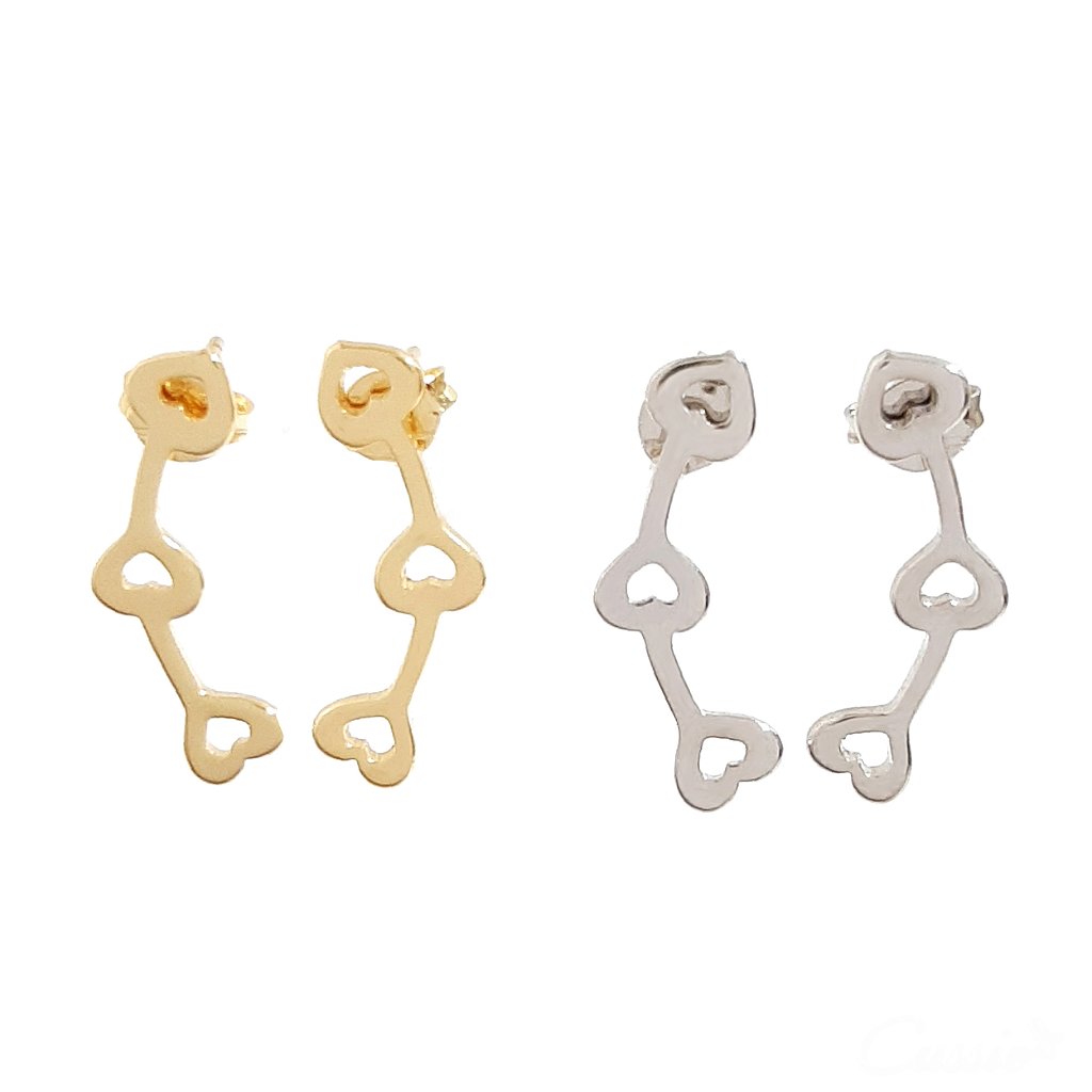Brinco com três corações pequenos e vazados em corte a laser. Pode ser usado como ear cuff.