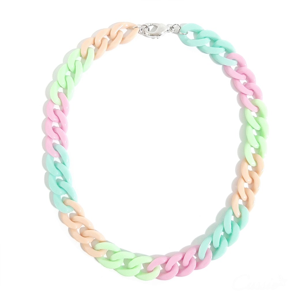 Colar de elos de resinas coloridas em tie dye (nude, verde claro, rosa claro e azul claro) com fecho lagosta grande.