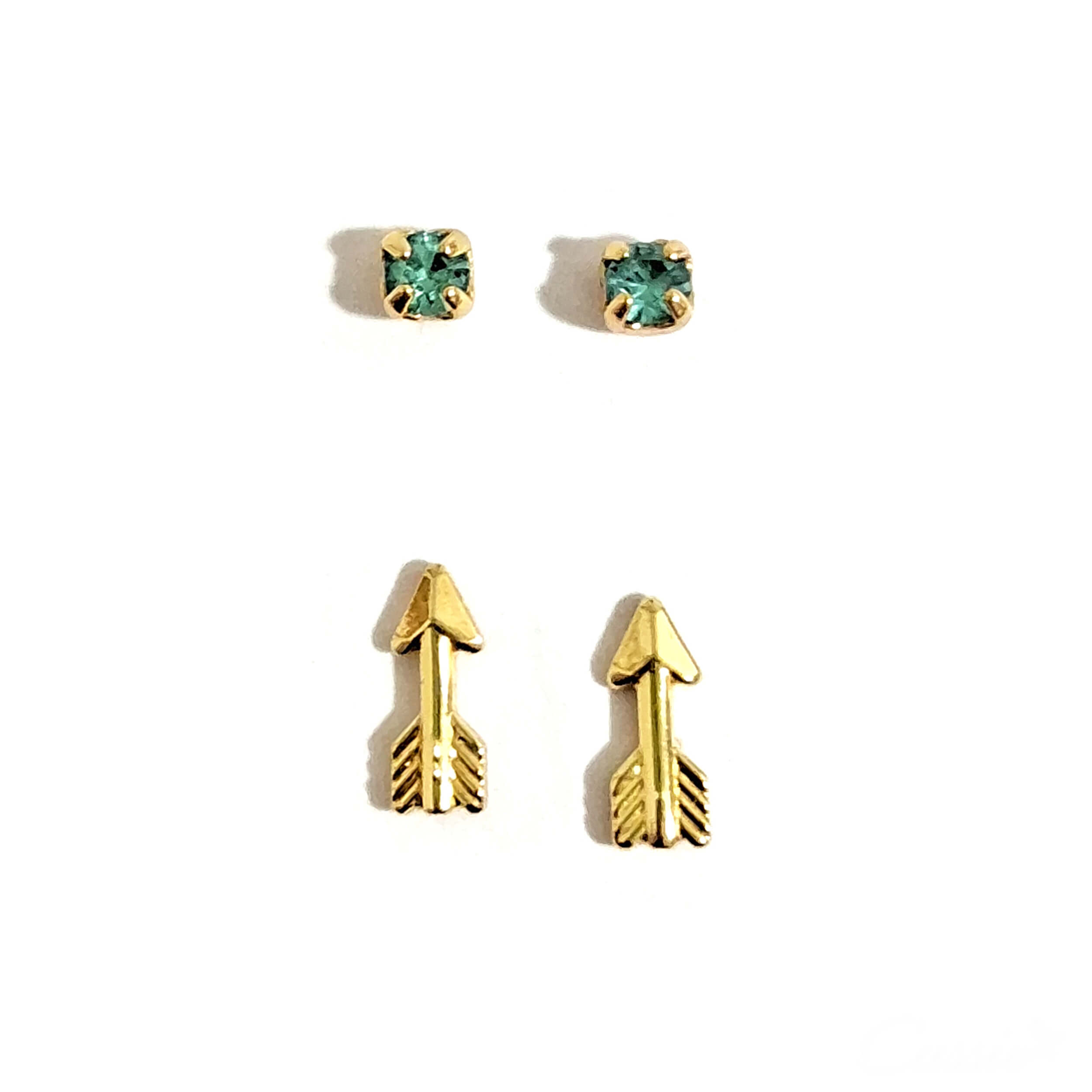 Kit com dois brincos pequenos, composto por um delicado Brinco Flecha Pequena e um Brinco de Segundo Furo com Strass Azul Turquesa.