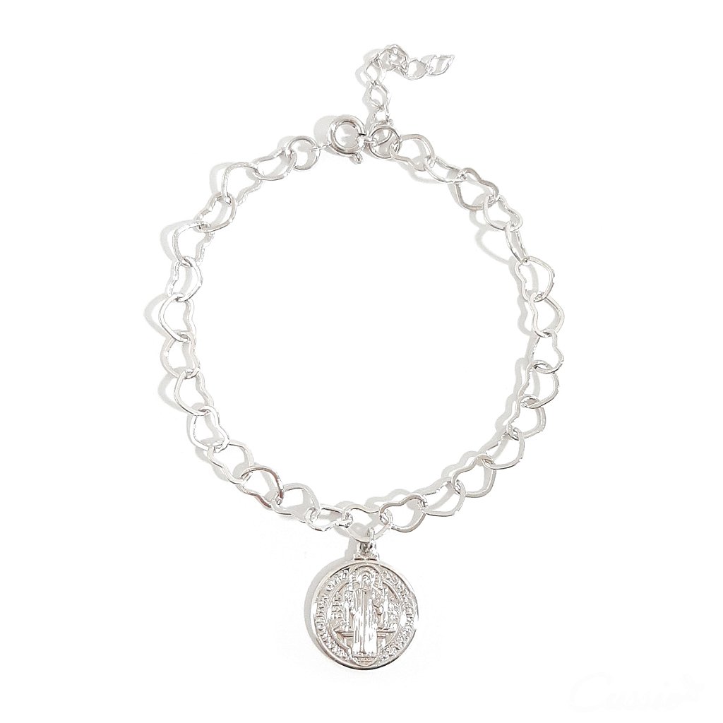 Pulseira de corrente de corações grandes com medalha de São Bento e extensor.